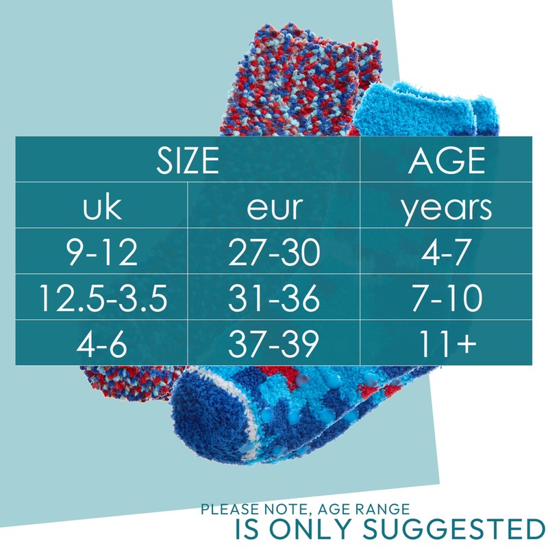 - BOYS SOCKS - The boys fluffy socks are available in size from UK 9-12 up to 4-6 in range of colour and design. Each pack includes one fluffy pair and one pair with popcorn texture.