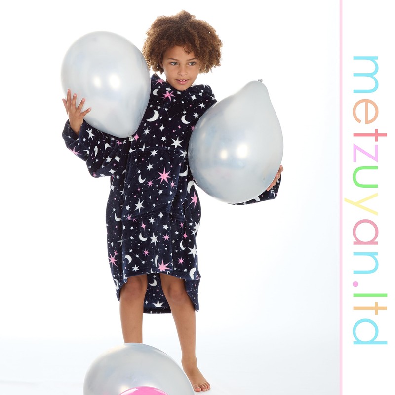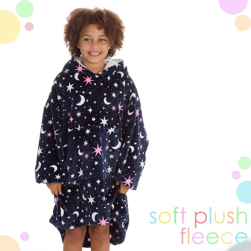 WS-AW23 Kids Girls Oversized Hoodie Blanket Sherpa Fleece Lined Hood Long Sleeved Giant Lounge Hoody Top Celestial Stars Blue One Size