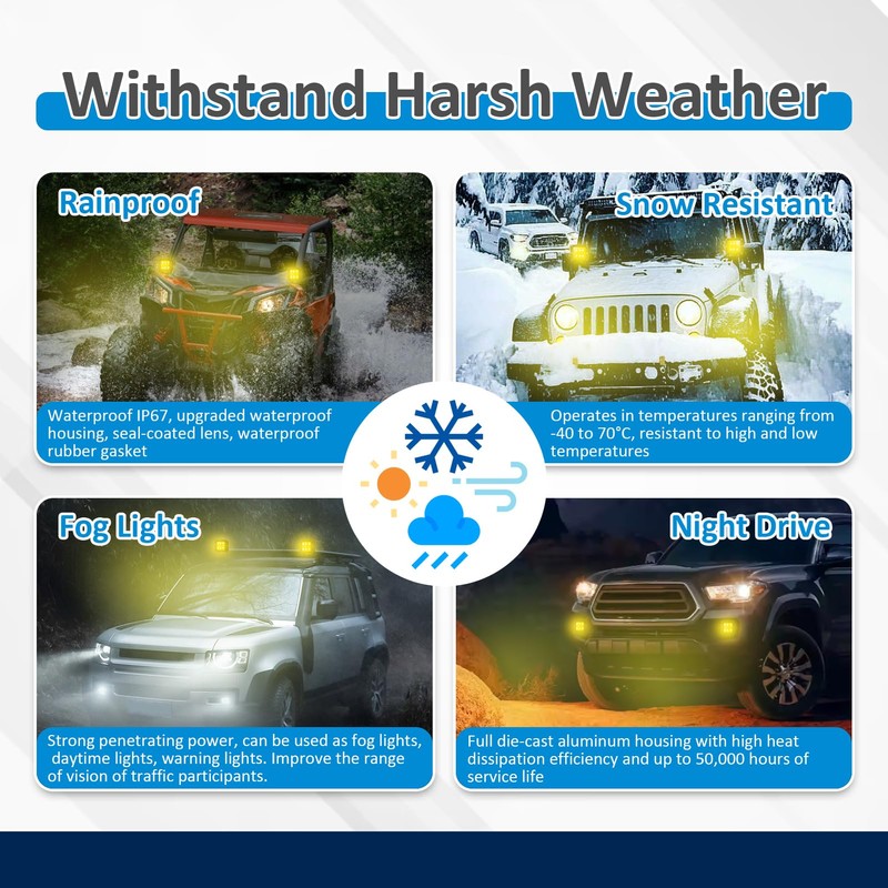 - Excellent LED visibility: Have 6 high-performance 4W LED chips, 3360LM, yellow light, wider and more eye-catching illumination in rainy and foggy weather, better warning function
