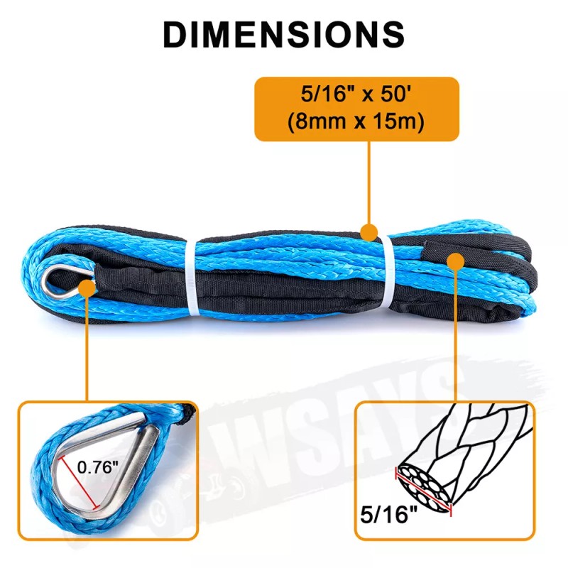 WSAYS 5/16" x 50' Synthetic Winch Rope Line Recovery Cable 12000LB for UTV Jeep Winch