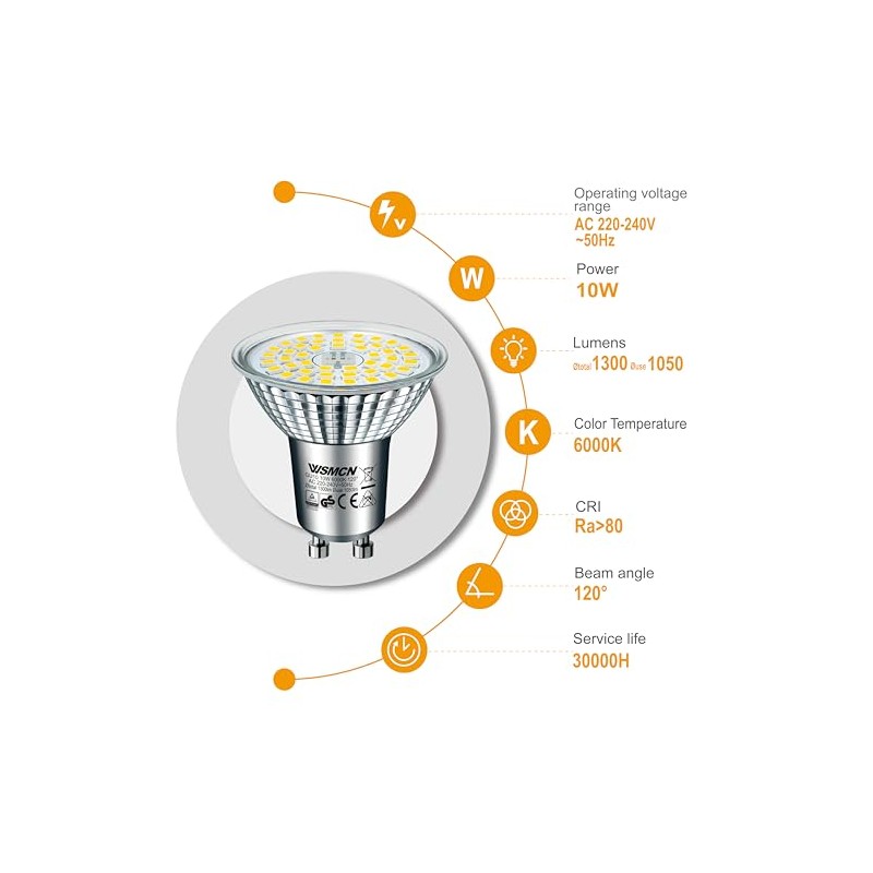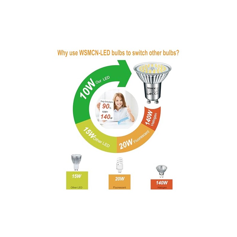 • Exzellente Farbwiedergabe CRI>80 WSMCN GU10 LED Lampen strahlen ein angenehmes Licht ?hnlich wie Halogenlampe aus. Farbwiedergabe (CRI>80) und Konsistenz (SDCM<6) fr echte, lebendige, natrliche und ansprechende Farben. Die LED Birne ist nicht dimmbar. Die abgegebene W?rme ist viel geringer als die von Halogen. Bringen Sie immer eine entspannte und angenehme Atmosph?re.