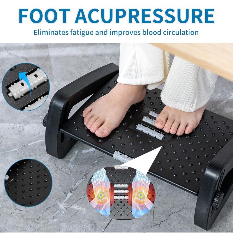 - Undertable footstool: Our dual function design features textured massage nodules and surface built-in rollers. By gently shaking your feet on the panel during working hours, this ergonomic tool can stimulate blood circulation in the soles of your feet and provide effective foot relaxation.