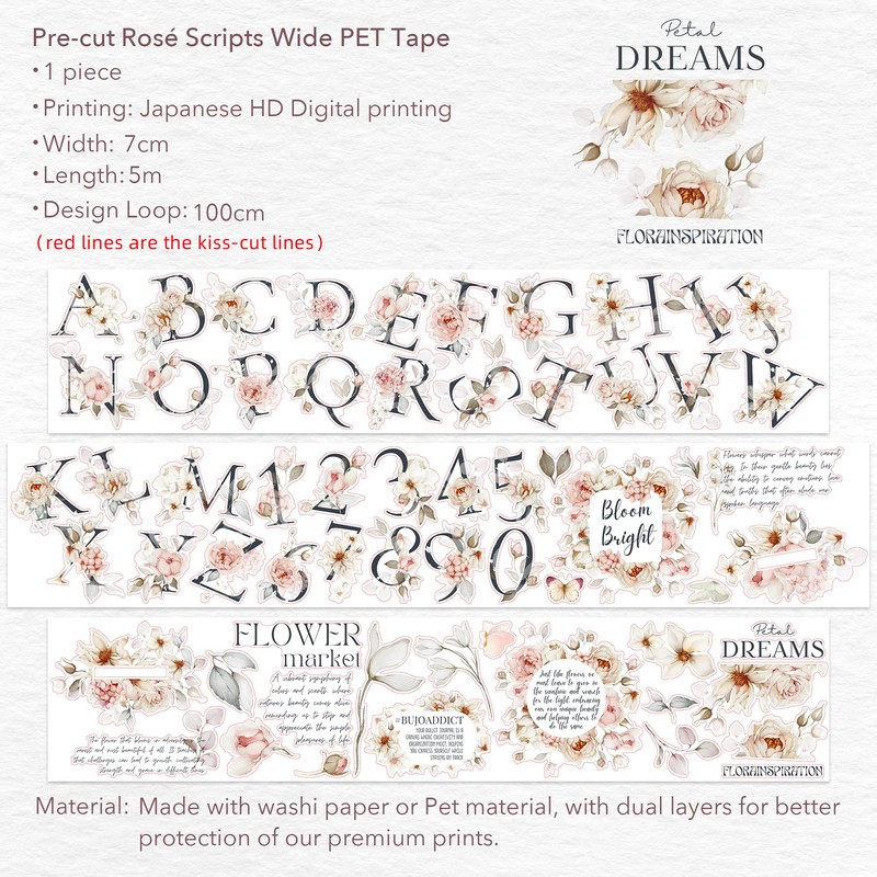WT Pre-Cut Rosé Scripts Wide PET Tape, Single Roll, Original Designs, Blush Floral & Handwritten Script, Clear Decorative Tape for Junk Journal, Scrapbook, Bujo, Planner, DIY Crafts