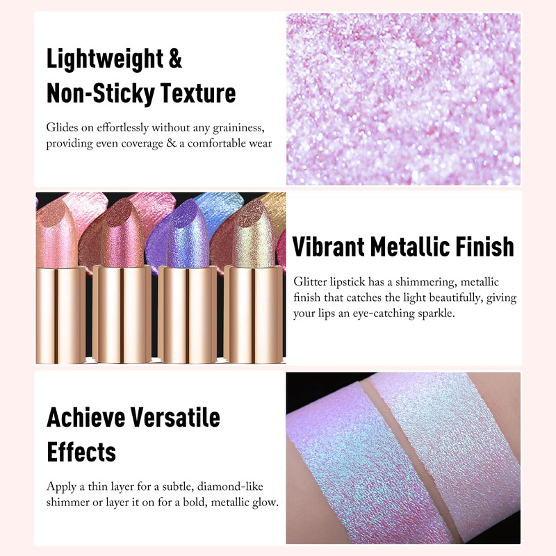 - Versatile Use for Any Occasion: Create endless looks with this highly versatile shimmer lipstick! Wear it alone for a bold, statement-making effect, or layer it over lip gloss to add dimension and sparkle. Ideal for both dramatic evening looks & everyday use