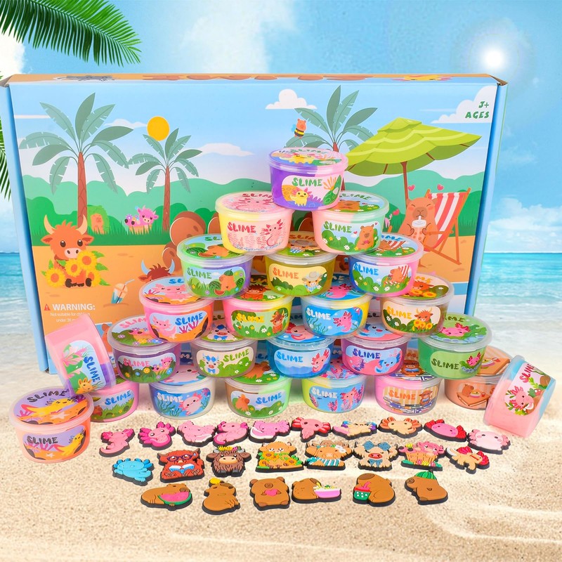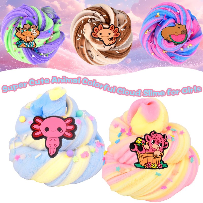 WUJYLY 24 Pack Slime Kit – Soft & Non-Sticky Butter, Cloud & Crystal Slime – 12 Axolotl, 6 Highland Cow, 6 Capybara Charms – DIY Slime Toys for Kids, Stress Relief, Party Favors, Gifts