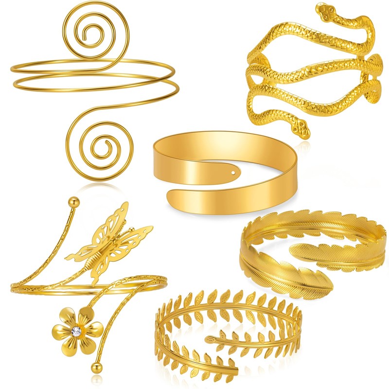 - Gold Arm Cuff Set: These Arm cuffs include 6 gold arm cuffs in various styles—leaf, feather, wide band, goth, butterfly and snake arm cuff. With a minimalist aesthetic, these pieces exude glamour and sophistication to meet your diverse needs.