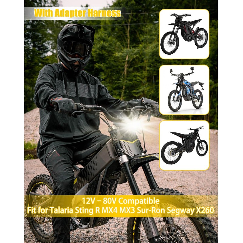 - Universal Voltage Fit: Universal motorcycle headlight kit supports a wide voltage range (12V to 80V) and includes a plug-and-play adapter harness, making it compatible with a variety of motorcycles and scooters, fit for Talaria Sting R MX4 MX3 Sur-Ron Segway X260