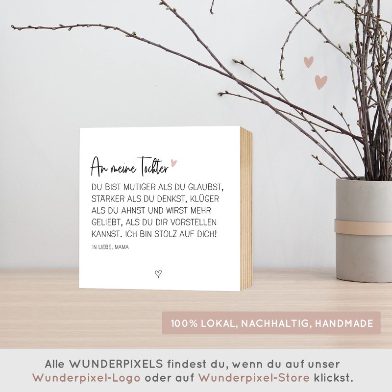 Wunderpixel® Holzbild Mutige Tochter - Geschenk von Mama - 15x15x2cm zum Hinstellen/Aufhängen, echtes Foto mit Spruch auf Holz - schwarz-weißes Wand-Bild Aufsteller zur Dekoration, Andenken