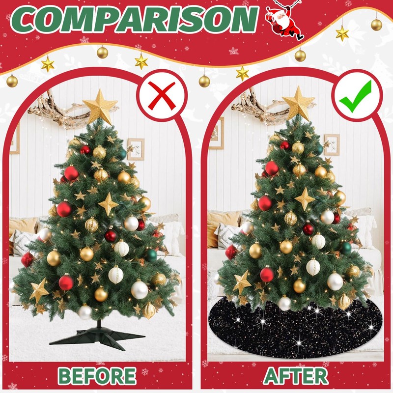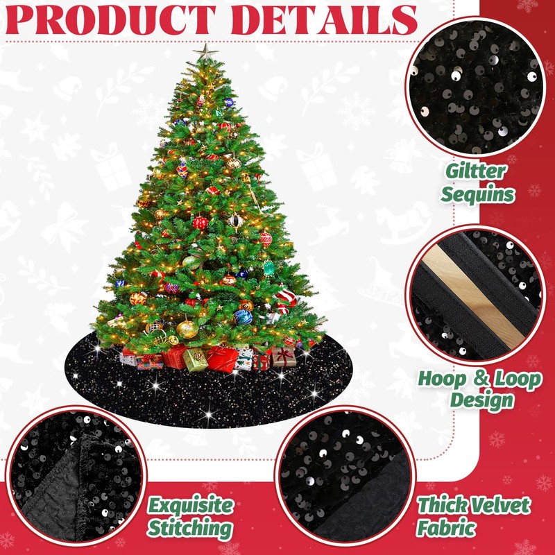 - 🎄【Hook & Loop Design - Black Christmas Skirt】The christmas tree skirt comes with an invisible hook & loop for easy installation. Just open the hook & loop and wrap the rustic tree skirt around the base of your Xmas tree. The bright color and sparkling sequins complement a wide variety of ornaments, such as gift boxes, lights, and Christmas balls, etc.