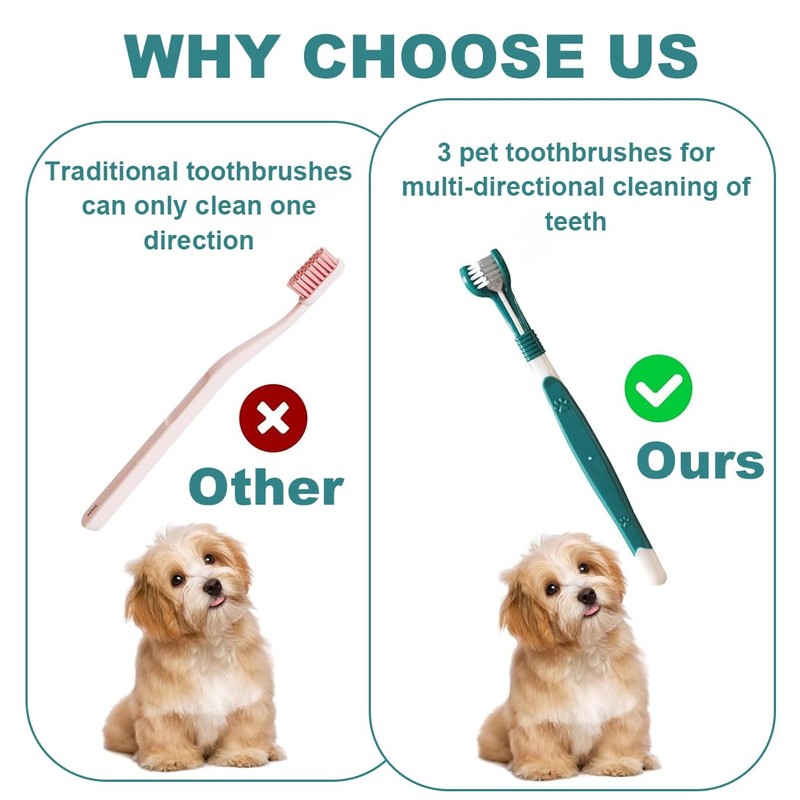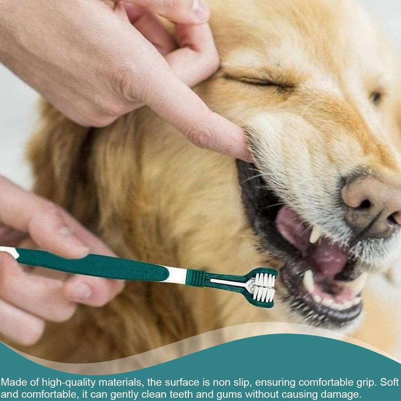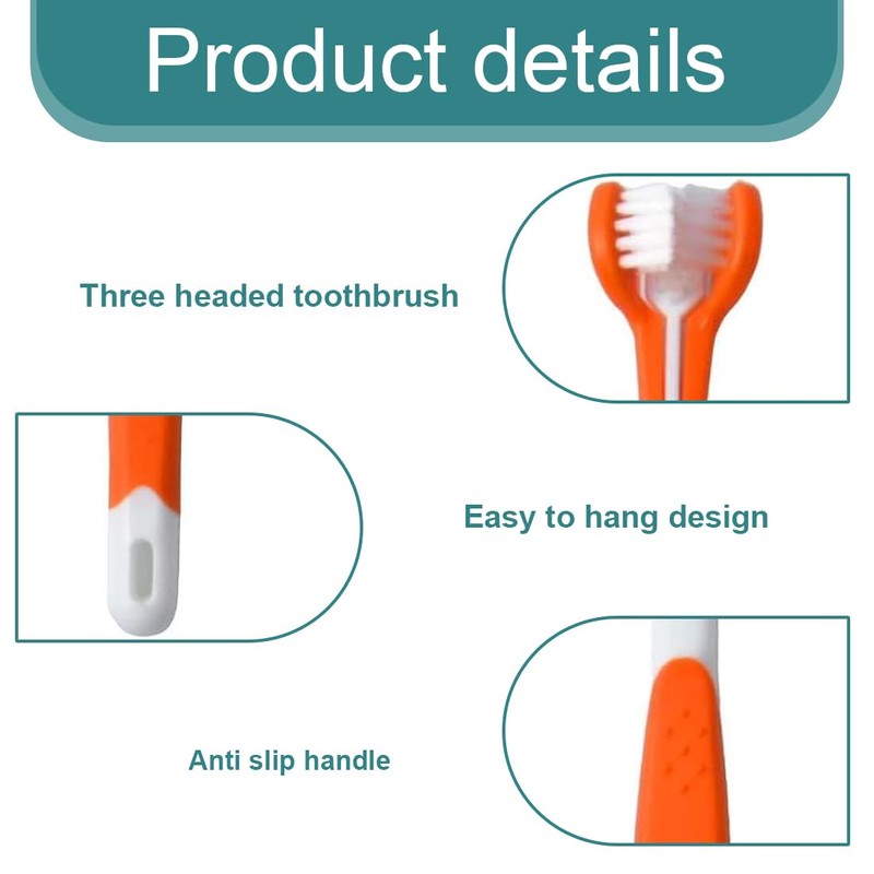 - Dreifachkopf-Zahnbürste: Drei Bürstenköpfe reinigen die Zähne Ihres Haustiers gründlich und effizient. Weiche Borsten schützen das Zahnfleisch vor Verletzungen. Der rutschfeste Gummigriff liegt angenehm in der Hand, während das Hängeloch-Design eine einfache Aufbewahrung ermöglicht