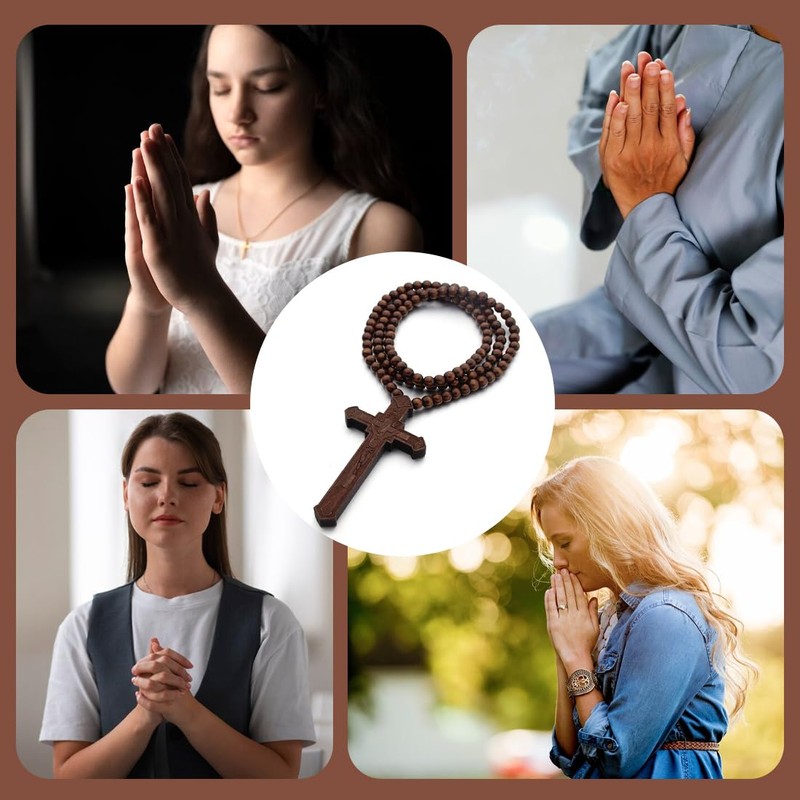 - Rosary: classic prayer necklace, brown cross rosary necklace.