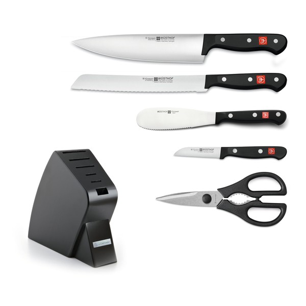- WÜSTHOF KNIFE SET – Includes a 2.75" Paring Knife, 5" Spreader, 8" Chef's Knife, 8" Bread Knife, Come-Apart Kitchen Shears and a Black Studio Knife Block