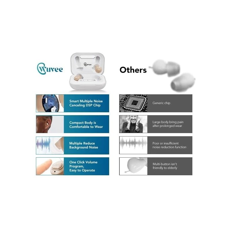 - Restore Authentic Human Voices. The hearing aids adopted of Wuvee self-developed the newest digital chip, these hearing aids utilize adaptive noise cancellation technology to filter out background noise. They can accurately capture and amplify human speech frequencies, ensuring crisp conversations in restaurants, family gatherings, and crowded environments.
