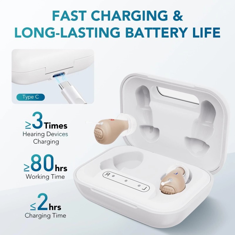 - Powerful Battery Performance. This rechargeable hearing aid utilize intelligent charging algorithms that can be fully recharged in just 2 hours and one charge can last at least 2 days. Portable charging case make sure you can recharge no matter where you are - whether at work, during travels, or on the go.
