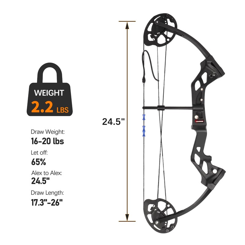 • BOW SPECIFICATIONS: 24.5" axle-to-axle; 16-20 lbs draw weight; 17.3"-26" draw length; 65% let-off; bow weight is 2.2 lbs, lightweight design. Meanwhile, WUXLISTY compound bow is a great gift for your family and friends.