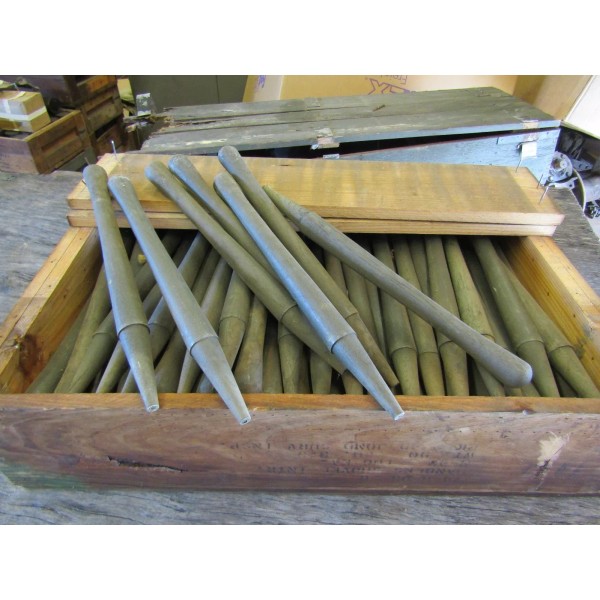 This is an original NOS e-tool replacement handle. This is the WWII and Korean War era entrenching tool. This is the real thing in in excellent NOS condition. These look to be made of white oak and then green painted. They are right at 18" long.  They are 1949 dated and the real thing.  Now you can replace your worn or broken handle with an original.