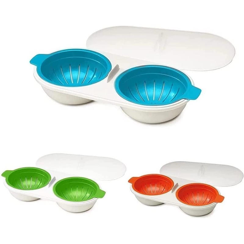 WWLUCKY Draining Egg Boiler for Microwave, Perfect Double Egg Poacher, Silicone Egg Boiler Cups, Double Egg Cups for Boiled Eggs, Draining Egg Boiler Set, Kitchen Cooking Gadget Tools, Blue
