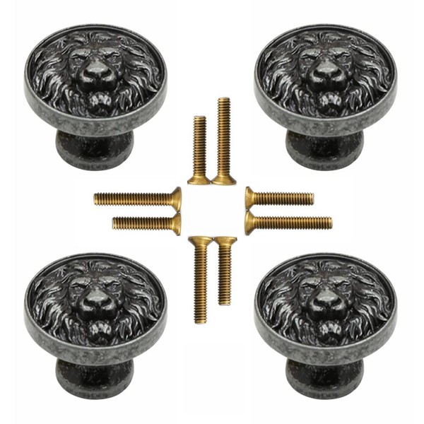 Wwxuanke 4pcs Knobs Flat Lion Head Knobs for Cabinets and Drawers 1.14in Cabinet Hardware Single Hole Solid Knob for Kitchen, Living Room, Bedroom (Antique Silver)