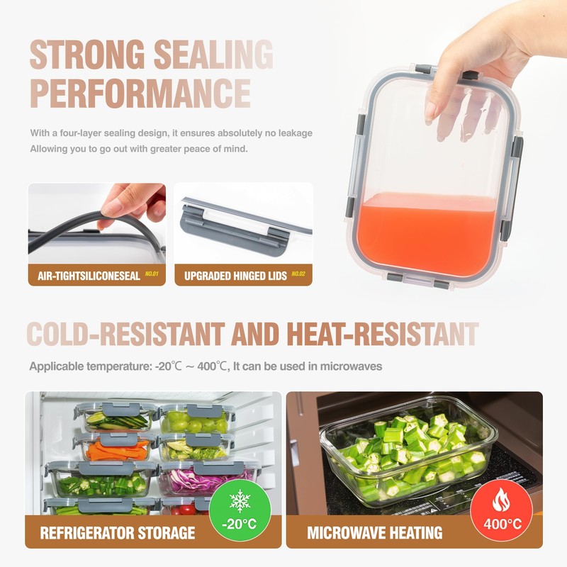- ✅Airtight Locking Lids: The airtight glass lunch containers feature BPA-free spring-locking lids. They ensure no spills or leaks and keep food fresh, so you no longer have to put up with soup or sauce spilling and dirtying the lunch box. The lids can be easily opened and closed without getting damaged or failing over time. The lids are not suitable for ovens, microwaves, or dishwashers; please remove the lids before heating food or washing.
