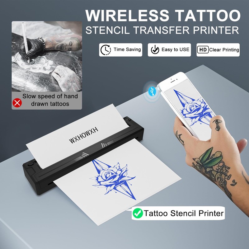 - Compact Tattoo Printer - The WXHOWXH Tattoo Kit is designed with precision for tattooing purposes. This thermal stencil printer for tattoos stands out for its featherlight and wireless design, weighing only 1.08 pounds – a fraction of the size of typical tattoo transfer machines at just 80%. Outfitted with a built-in, rechargeable battery, it frees you from the hassle of power cords, providing unparalleled convenience and user-friendliness for tattoo artists on the move.