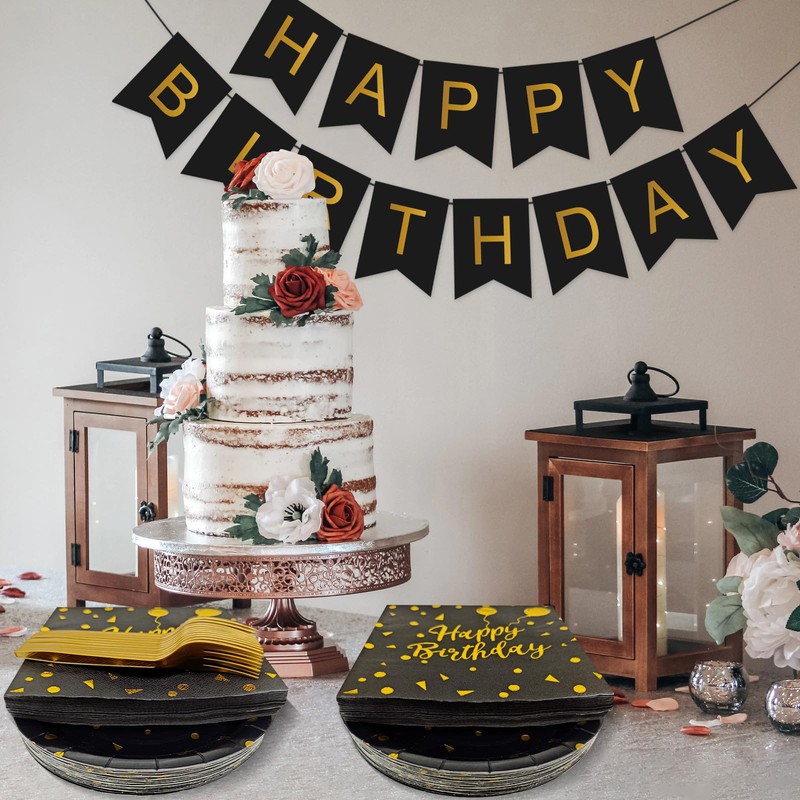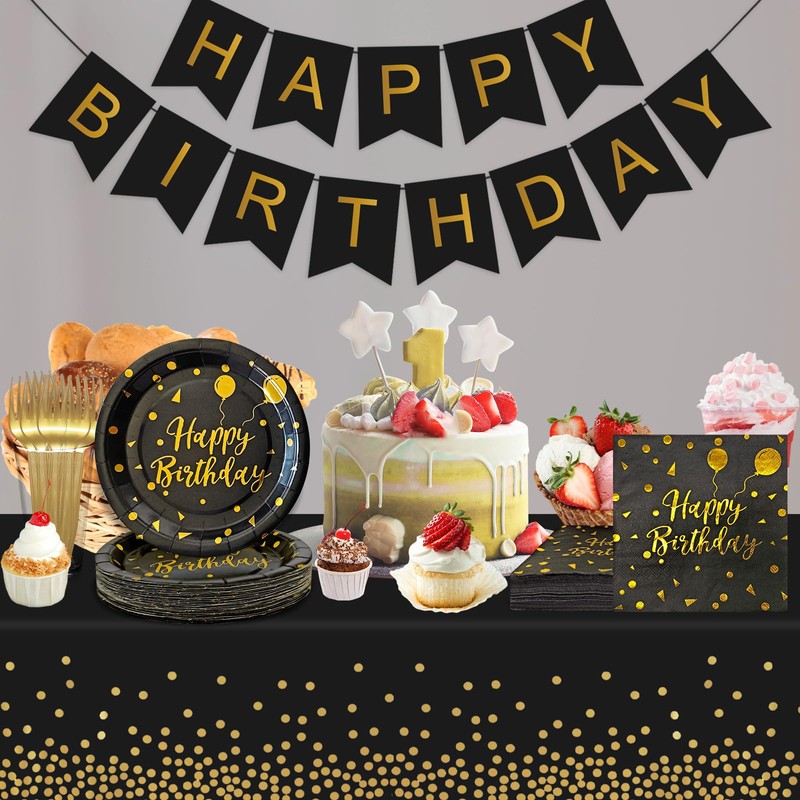 - The birthday party tableware is made of 350gsm thickened environmentally friendly paper,and the soak-proof layer on the surface,Cut resistant and Soak-Proof,black and gold birthday napkins are 2-ply,soft and absorbent.(NOTE: Do not microwave the disposable tableware)