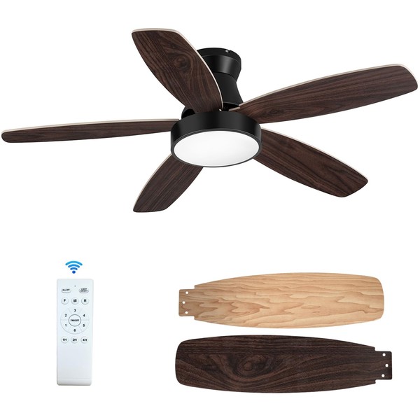 WXQGHDDF 42-Inch Ceiling Fan with LED Light, 5 Blades, 6-Speed Reversible, Remote Control, Dimmable, Low Profile, Dark Walnut and Black Housing