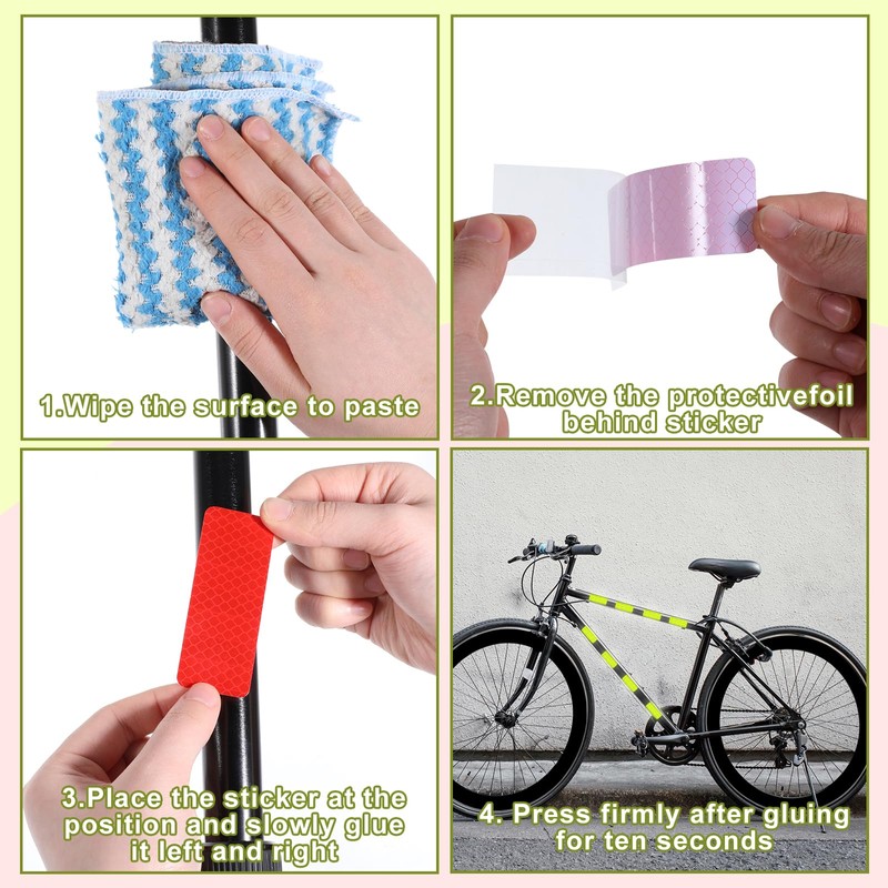 - 【Package Contents】You'll receive 30 pieces of fluorescent yellow-green and 30 red reflective stickers, sized 3.15" x 1.18", along with two alcohol wipes for cleaning.