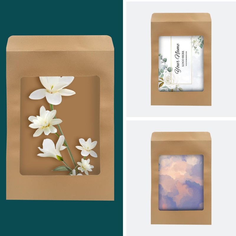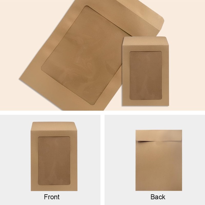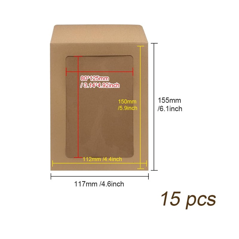- The products include: a total of 15 kraft window envelopes with transparent lamination on the outside of the envelopes for protection and inspection of the contents, the inner dimensions of the envelopes are 15 x 11 cm. (This envelope does not contain glue and cannot be sealed by itself. Card not included)
