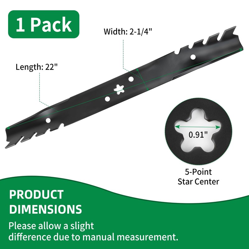 - 【Package Details】1x mulching blade. Length: 22 inches, Width: 2-1/4 inches, Thickness: 0.17 inches, Center Hole: 5 point star, For deck size: 42 inches, Blade Type: mulching blade. The mulching blade comes with 5 point star center hole, please verify the spindle of your mower before your order.