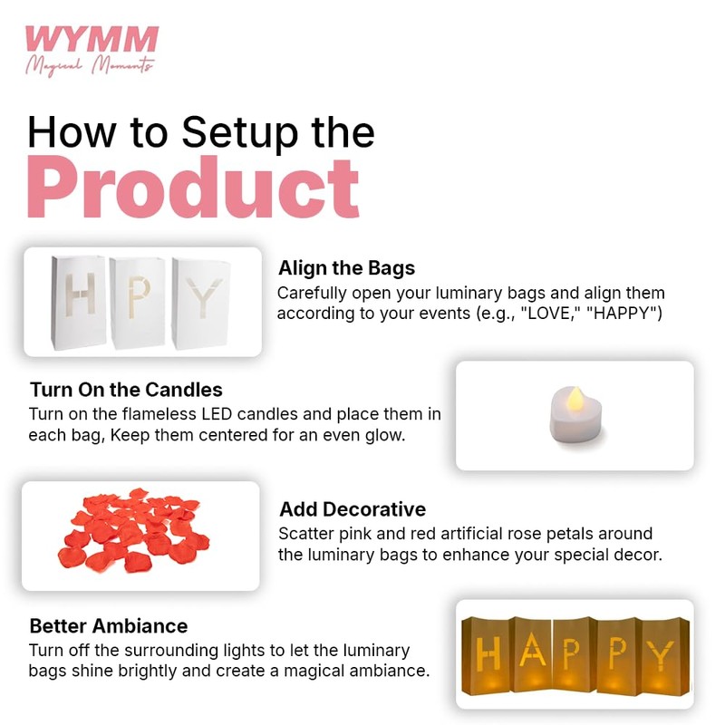 - NO POWER OUTLET NO BATTERIES NO PROBLEM - Each paper bag measure 6X10.5 inches. The kit comes with heart shaped flameless tealight candles for each letter to be placed in the bags and with 2000 red and pink rose petals for a romantic wedding decorations for reception