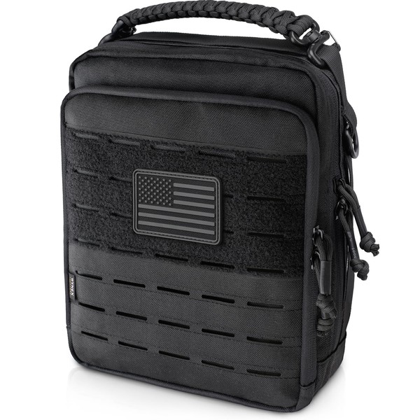 - THREE WAYS TO CARRY: Tactical Admin Pouch features three vertical back straps with metal snaps compatible with all Molle/PALS system like tactical backpacks and vests. Three exterior webbing straps for vertical/horizontal carry with FREE removable paracord woven carry handle. You can use the shoulder strap (NOT Included) to attach 2 D-rings for hands-free.