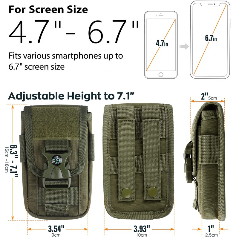 • EXPANDABLE HEIGHT: Tactical Phone Pouch has a front flap with adjustable height buckle strap fastening that can provide enough room for 4.7"-6.7" cell phone with a slim protective case on, like iPhone 14 Pro Max/14 Pro/13PM/13/12 / Galaxy S10/A53 / Note 10+ / Moto G Power / Pixel6, etc. Adjustable Height: up to 18cm / 7.1 inches.