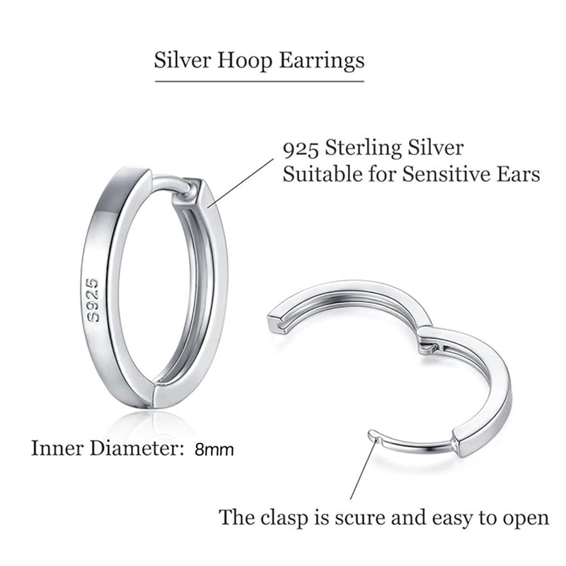 wynn's Silver Hoop Earrings for Women, 925 Sterling Silver Hoop Earrings Set, Unisex Small Sleeper Hoop Earrings, Silver Hooped Huggie Cartilage Earrings for Women Men Girls (8mm)