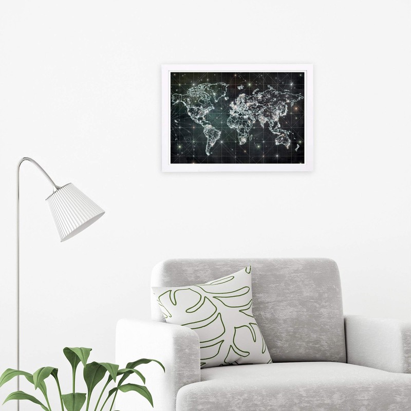 Wynwood Studio Maps and Flags Framed Wall Art Prints 'Mapamundi Galaxy' Home Décor, 19" x 13", Black, White