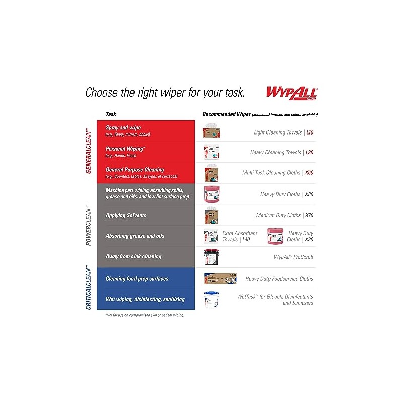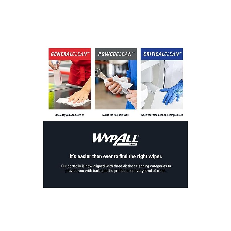 WypAll is the number one brand of disposable wipes in the US and Canada. Create a clean work environment with light to medium duty general cleaning solutions. Pound for pound, WypAll General Clean X60 Multi-Task Cleaning Cloths absorb more than two times as much water as rags. They bring the absorbing power of HydroKnit technology (for superior absorbency) to a lighter-weight cloth. Designed to outperform laundered rags, WypAll General Clean X60 Multi-Task Cleaning Cloths help raise the standard for general-purpose cloths at a terrific value. They don't use adhesives or binders, so they'll leave no residue behind, and they're reinforced for strength when wet or dry. They can be used for applying thinners and solvents, in cable lubricant removal, adhesive cleaning and removing grease and soil in tight areas. These cleaning towels come in a Pop-Up Box dispenser and are so sturdy that they can often be used more than once (once you've used them a few times, they're disposable). They're designed to reduce waste so you spend less. When effectiveness and value top your list of criteria, you can trust WypAll General Clean X60 Multi-Task Cleaning Cloths to deliver.