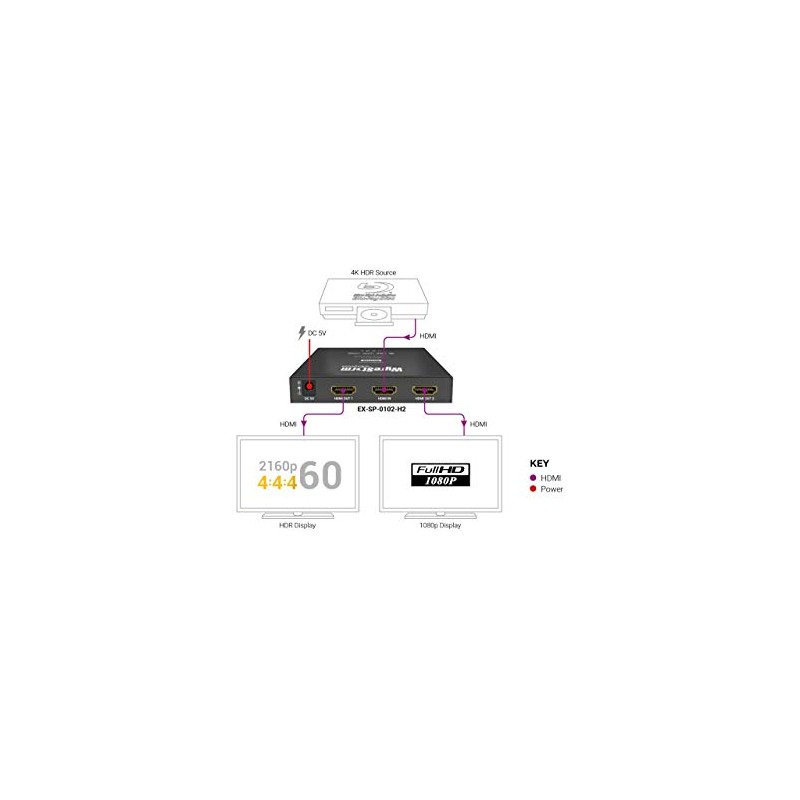 - Allows a transmission from a single HDMI audio/video device to be duplicated and simultaneously distributed to two HDMI display devices
