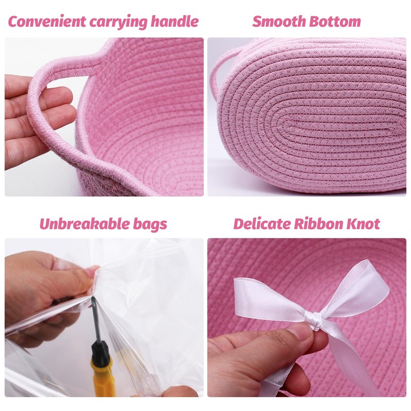WYYFXY® Empty Gift Basket Braided with Cellophane Bags and Bow, Basket Gift Cotton Rope Baskets for Gifts, Holidays, Birthdays (Pink)