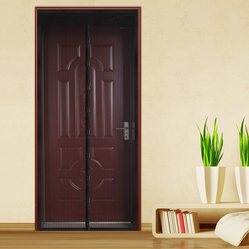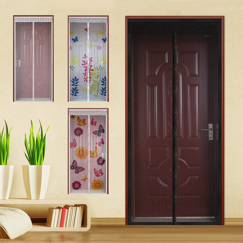 **WYZwork Magnetic Screen Door** is an easy install screen door that goes perfectly into any household. Can be installed by strong double-sided adhesive strips built to stick into most household surfaces or by the use of tacks when placing upon non-stick surfaces. Includes optional overhead elegant lace draping design **Dimensions:** 39 inches in total width. 82 inches in total height. (includes adhesive area) **Available in 4 styles:** Plain Black, Plain White, Floral design, Summer design