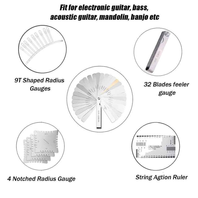 • 【 Comprehensive Package】: Our Guitar Toolkit includes:1 x Guitar Ruler,4 x Acoustic Guitar Radian Ruler,9 x Understring Radius Gauges,1 x 32 B Feeler Gauge.