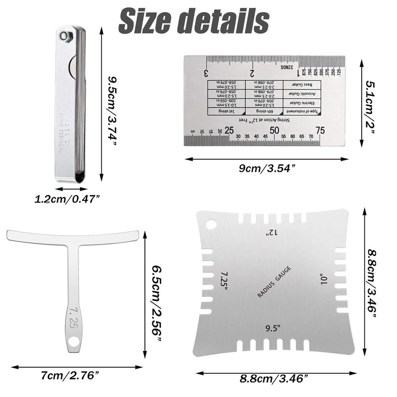 • 【Universal Size】: Each accessory in this guitar tool kit is designed to universal size standards. The understring radius gauge comes in 9 sizes: 7.25 inch, 9.5 inch, 10 inch, 12 inch, 14 inch, 15 inch, 16 inch, 17 inch, and 20 inch. These various sizes make them suitable to meet your guitar maintenance requirements for different instruments.