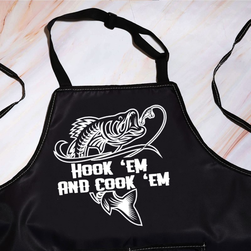 WZMPA Funny Fishing Apron with 2 Pockets Fishing Camping Lovers gifts Hook 'EM AND cook 'EM Outdoorsman BBQ Cookout Apron, Hook 'Em, Medium