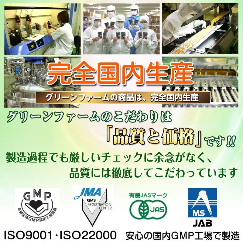 • ✅【国内基準:ISO22000所得工場で製造】グリーンファームの製品は、とても厳しい工場検査をクリアした日本国内工場でサプリメントや製品を製造しております。どこの誰でも安心・信頼できるサプリメント会社として、日々製品の生産地や成分にこだわるのはもちろんですが、社員一同「お客様対応第一」を心がけております。