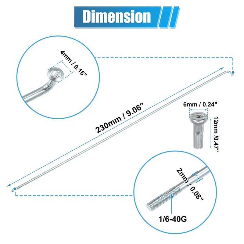 - Dimensions: Spokes Size: 235x8mm / 9.25"x0.31"(L*W), Spokes Shaft Dia.: 2mm / 0.08", Thread Size: 1/6-40G, Elbow Head Dia.: 4mm / 0.16", Spokes Length(without Elbow): 230mm / 9.06"", Nipple Size: 12x6mm / 0.47" x 0.24" (L*D)