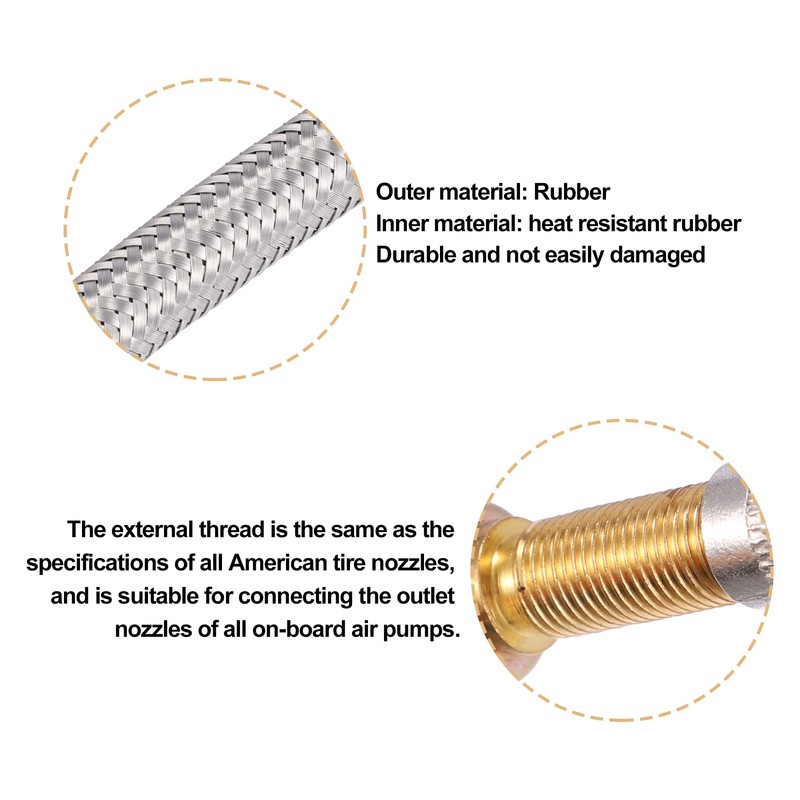 - Made of good material, corrosion resistant, wear resistance, good performance, durable and flexible. The tire air inflator hose adapter is made of durable stainless steel and a heat resistant rubber hose, durable and not easily damaged.