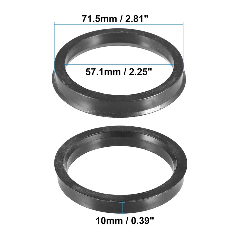 - Inner Diameter: (Vehicle Hub Size) 57.1mm / 2.25"; Outer Diameter: (Wheel Bore Size) 71.5mm / 2.81"; Thickness: 10mm / 0.39"; Size: 71.5x10mm / 2.81"x0.39"(D*T)