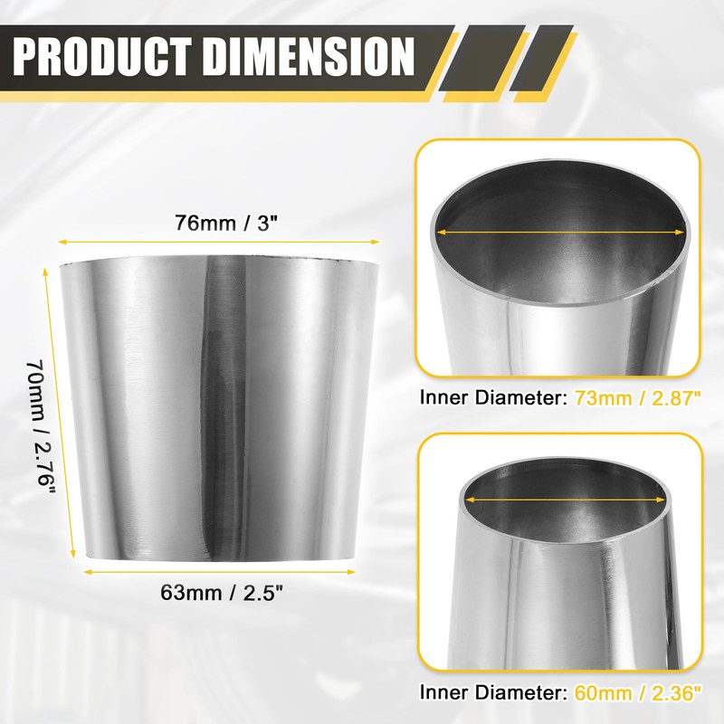 - Pipe Specification: Input Outside Diameter: 63mm / 2.5"; Output Outside Diameter: 76mm / 3"; Height: 70mm / 2.76"; Wall Thickness: 1.5mm / 0.06".
