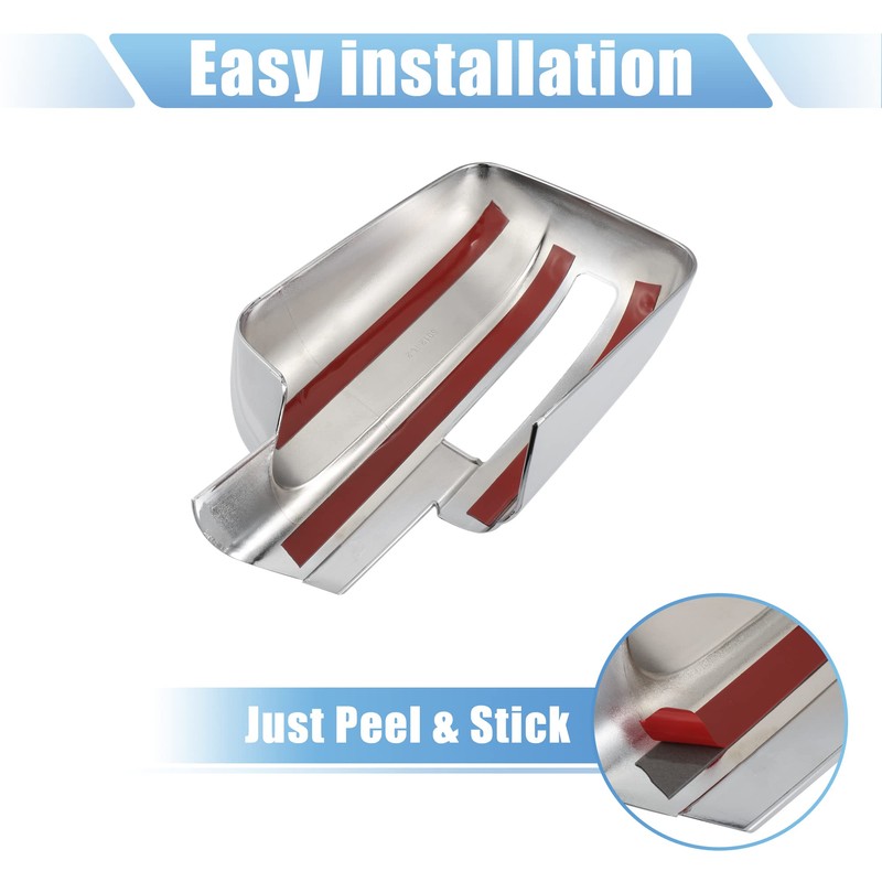 Easy installation. Just peel and stick on the mirror, not a mirror cover/cap replacement. Firmly, not easy to fall off.