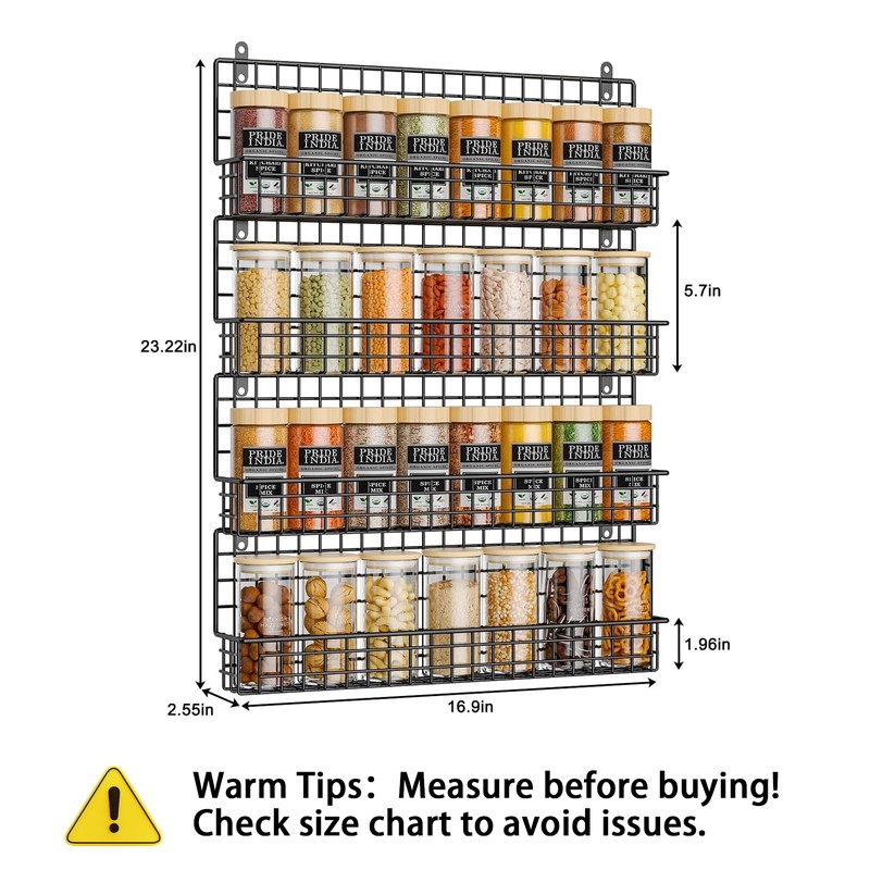 - 【Strong and Durable Construction】The 4-tier spice rack made of by thicken iron wire,to make it more stability and durability,and mounting hardware included.Single layer size: 17"L x3"W x5.6 "H; 4 layers size: 17"L x3"W x 23.3"H