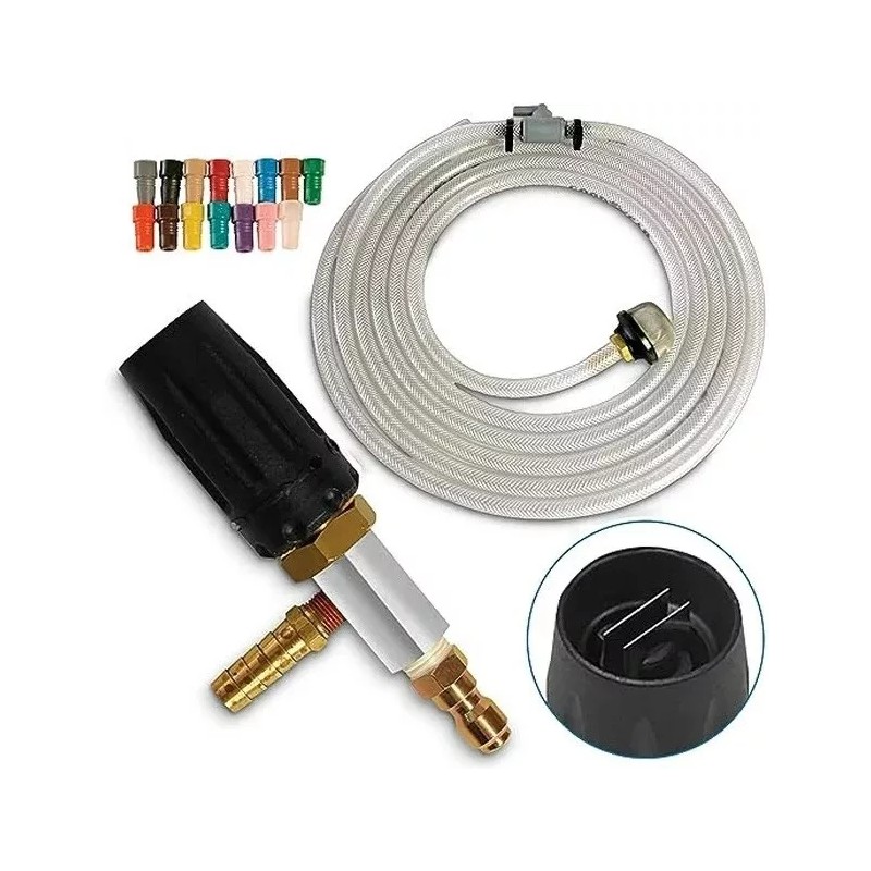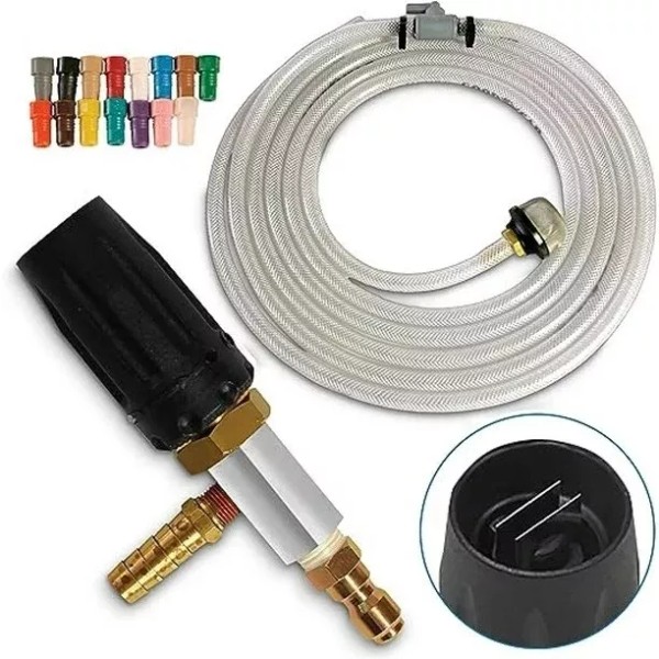 This easy to use item attaches to both your pressure washer wand and its own special X-Jet suction hose (included). As pressurized water exits your spray lance, through the X-Jet nozzle, the suction hose draws and proportions the appropriate amount of chemical from a separate tank. The mixing happens in the nozzle! Simply twist the X-Jet M5 to change spray patterns from 5° to 60°, without the need for multiple tips.