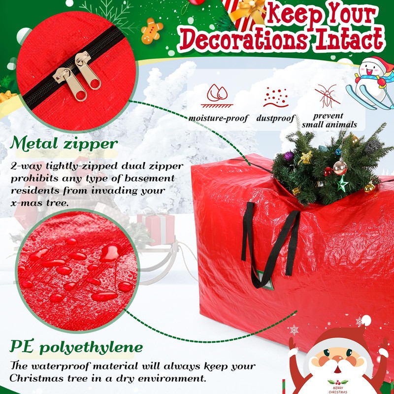 - Details of Christmas Tree Bag: There are two heavy-duty reinforced handles on each side of the bag for carrying and convenient transfer. 2-way tightly-zipped zippers are easier to open and close and are more durable than one-way zippers